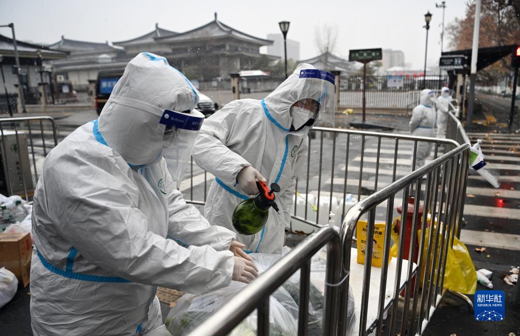 12月25日,西安市小寨東路一封控小區(qū)的工作人員將外賣配送的蔬菜進行消毒。