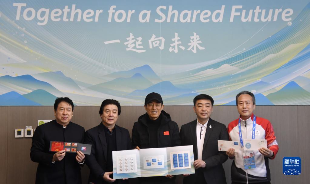2月5日,冬奧會開幕式總導演張藝謀(中)、郵票設計者王虎鳴(左二)在紀念郵票正式發(fā)行新聞發(fā)布會上展示《第24屆冬季奧林匹克運動會開幕紀念》紀念郵票。