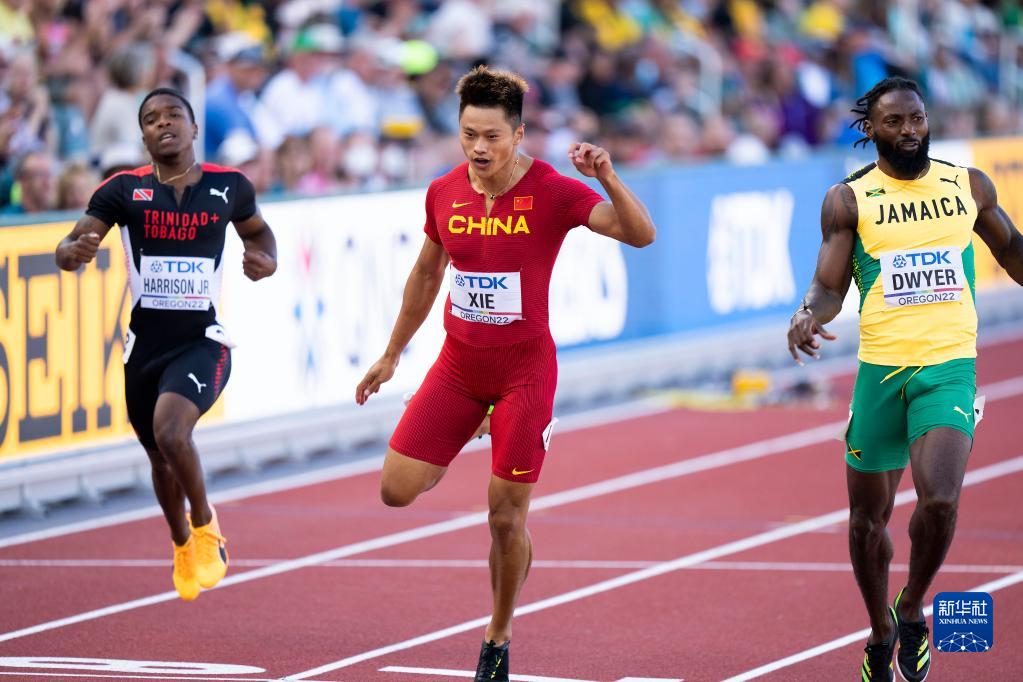 7月18日,謝震業(中)在預賽中沖過終點。新華社記者 王迎 攝