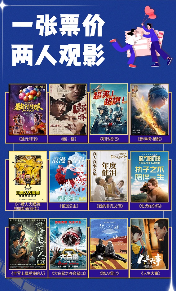 期間,《獨行月球》《遇見你》《明日戰記》《斷·橋》《漫長的告白》《新神榜:楊戩》《小黃人大眼萌:神偷奶爸前傳》等多部熱門電影上映,截至8月26日,已吸引近4000人參與,發放電影消費券8000余張。