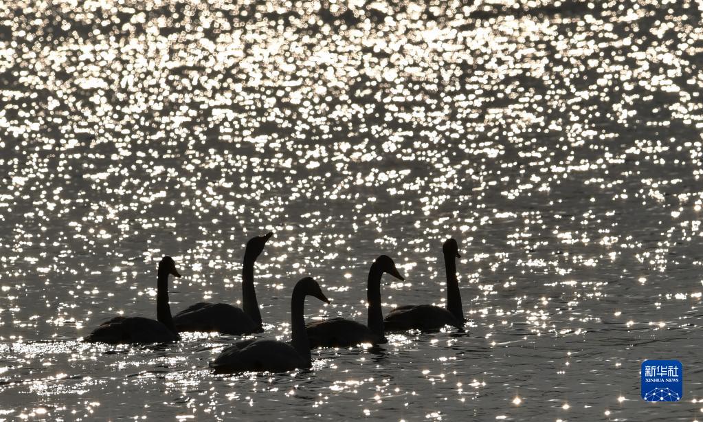 1月2日,大天鵝在三河口天鵝灘濕地的水面上游弋。