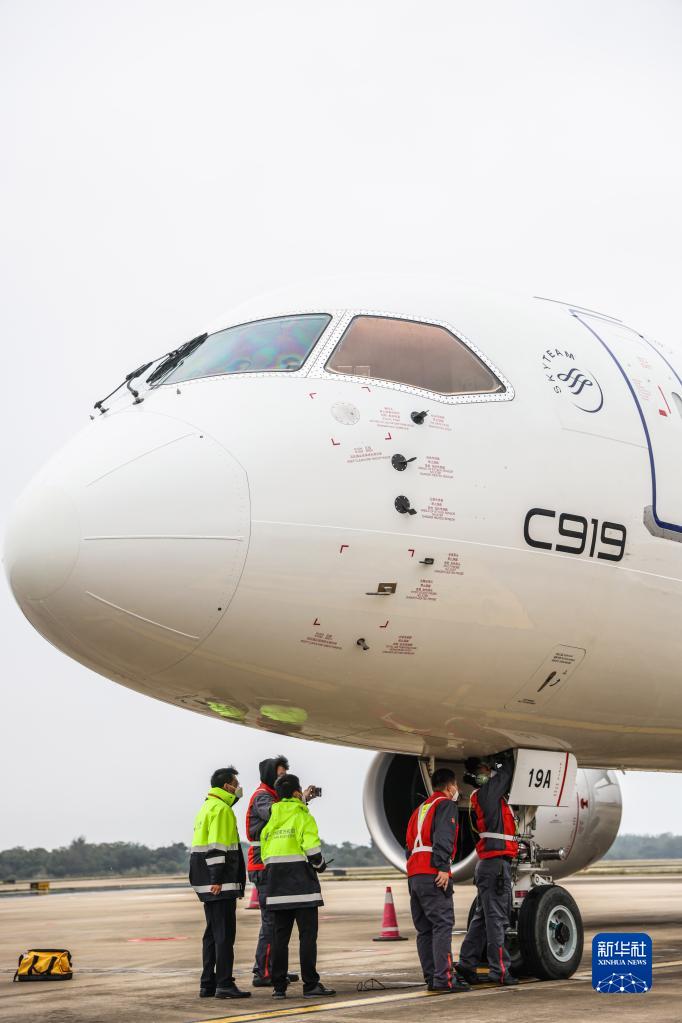 1月2日,海口美蘭國際機場的機務人員對國產大飛機C919進行落地檢查。