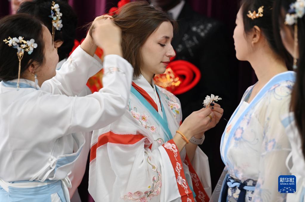 1月4日,在天津大學國際教育學院,留學生在彩排間隙整理頭發。 當日,天津大學國際教育學院的留學生為參加“校園春晚”加緊排練文藝節目。他們身穿漢服演唱中文歌曲,排練傳統古典舞蹈等節目,感受中國傳統文化的魅力。 新華社記者 李然 攝