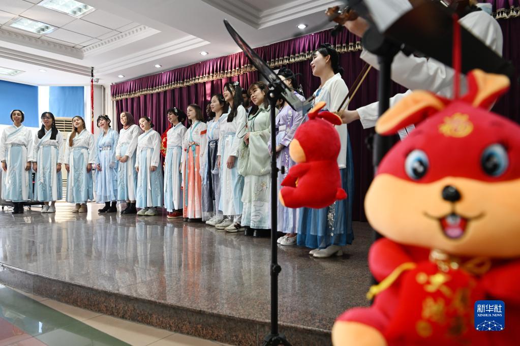 1月4日,在天津大學國際教育學院,留學生進行中文合唱的彩排。 當日,天津大學國際教育學院的留學生為參加“校園春晚”加緊排練文藝節目。他們身穿漢服演唱中文歌曲,排練傳統古典舞蹈等節目,感受中國傳統文化的魅力。 新華社記者 李然 攝