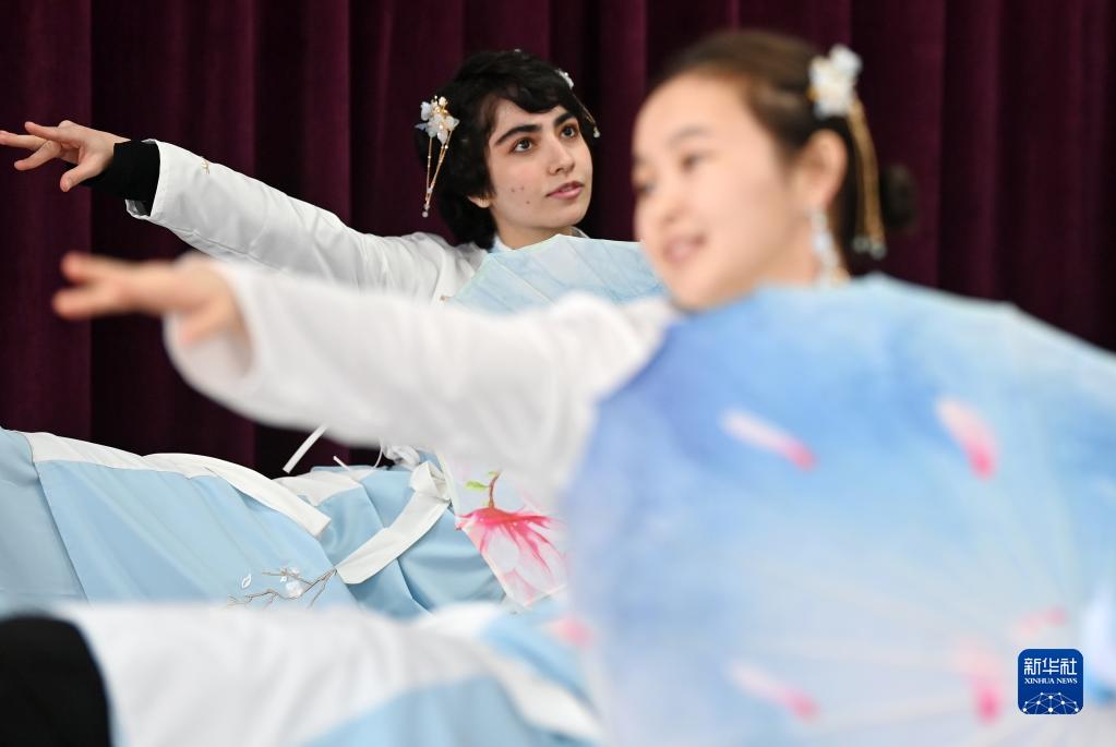 1月4日,在天津大學國際教育學院,留學生進行舞蹈節目的彩排。 當日,天津大學國際教育學院的留學生為參加“校園春晚”加緊排練文藝節目。他們身穿漢服演唱中文歌曲,排練傳統古典舞蹈等節目,感受中國傳統文化的魅力。 新華社記者 李然 攝