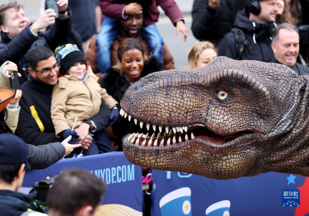 1月1日,在英國倫敦,人們在新年游行活動中與“恐龍”互動。
