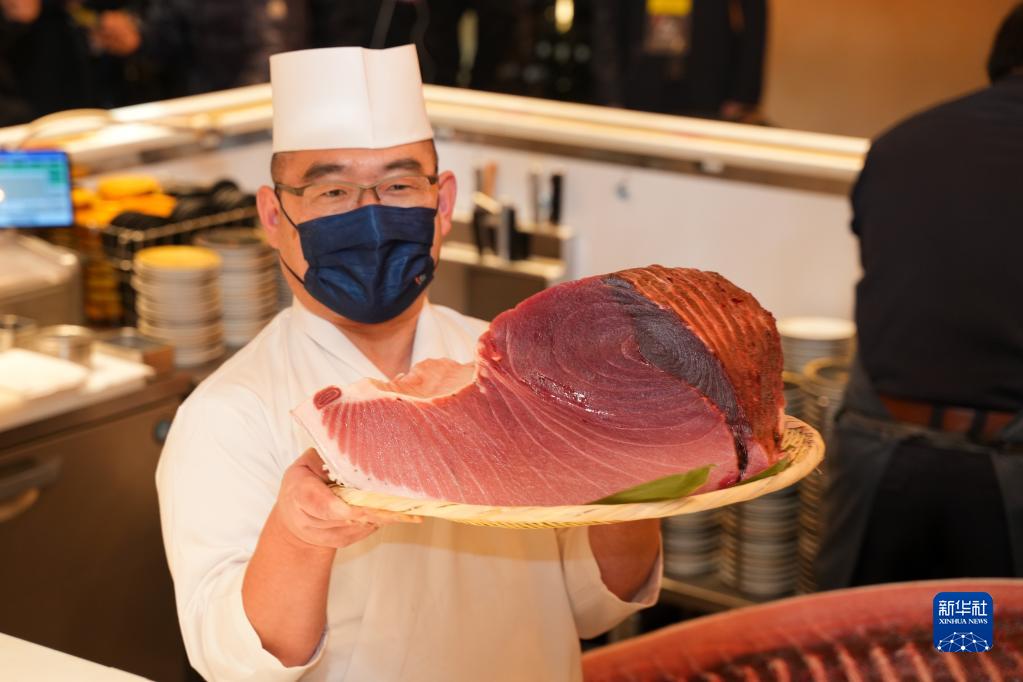 1月5日,廚師在日本東京表參道一家餐館向媒體展示最高價金槍魚的魚肉。 日本東京豐洲市場5日迎來今年首場金槍魚競拍交易,一尾來自青森縣大間港的藍鰭金槍魚以3604萬日元(1美元約合132日元)價格成交,創下當天最高競拍價。這也是“大間金槍魚”連續11年贏得新年首拍最高價。 新華社記者 張笑宇 攝