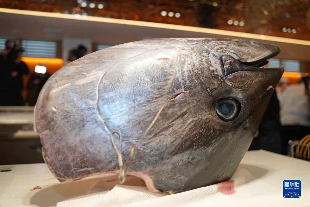 這是1月5日在日本東京表參道一家餐館拍攝的最高價金槍魚的魚頭。 日本東京豐洲市場5日迎來今年首場金槍魚競拍交易,一尾來自青森縣大間港的藍鰭金槍魚以3604萬日元(1美元約合132日元)價格成交,創下當天最高競拍價。這也是“大間金槍魚”連續11年贏得新年首拍最高價。 新華社記者 張笑宇 攝