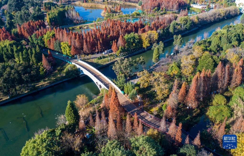 這是1月5日拍攝的海洪濕地公園一景(無人機照片)。 近期,云南省昆明市海洪濕地公園的水杉迎來觀賞季,吸引不少游客前來游覽。昆明海洪濕地公園位于滇池北岸、盤龍江入湖口西側,是滇池的一道湖濱生態屏障。 新華社記者 陳欣波 攝