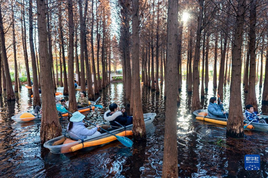 1月5日,游客在海洪濕地公園里劃船。 近期,云南省昆明市海洪濕地公園的水杉迎來觀賞季,吸引不少游客前來游覽。昆明海洪濕地公園位于滇池北岸、盤龍江入湖口西側,是滇池的一道湖濱生態屏障。 新華社記者 陳欣波 攝
