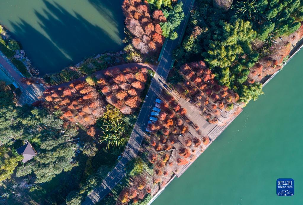 這是1月5日拍攝的海洪濕地公園(無人機照片)。 近期,云南省昆明市海洪濕地公園的水杉迎來觀賞季,吸引不少游客前來游覽。昆明海洪濕地公園位于滇池北岸、盤龍江入湖口西側,是滇池的一道湖濱生態屏障。 新華社記者 陳欣波 攝