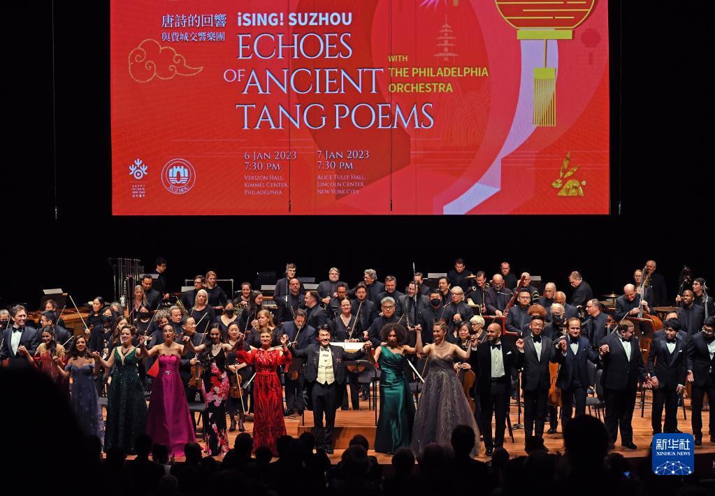 新華社紐約1月7日電(記者王建剛 劉亞南)“唐詩的回響”新春音樂會7日晚在美國紐約林肯中心舉行。中國常駐聯(lián)合國代表張軍、第77屆聯(lián)大主席克勒希、中國駐紐約總領事黃屏、聯(lián)合國高級官員、近40個國家常駐聯(lián)合國使節(jié)以及紐約各界人士約700人觀看了演出。 1月7日,在美國紐約林肯中心,參加“唐詩的回響”新春音樂會的藝術家謝幕。新華社記者 李睿 攝 當晚,來自中國、美國、加拿大等國的青年歌唱家與費城交響樂團和指揮家廖國敏合作,共同演繹了以《靜夜思》《將進酒》等唐詩名篇為基礎創(chuàng)作的音樂作品。 張軍在演出前的招待會上表示,唐詩蘊含著中國人對人類命運和生命價值的思考,其中富含的精神力量能夠跨越時空,超越國度,喚起心靈共鳴。“唐詩的回響”音樂會以全新方式演繹唐詩名篇佳作,是古典與現(xiàn)代藝術的碰撞、東方與西方文明的互動。 |