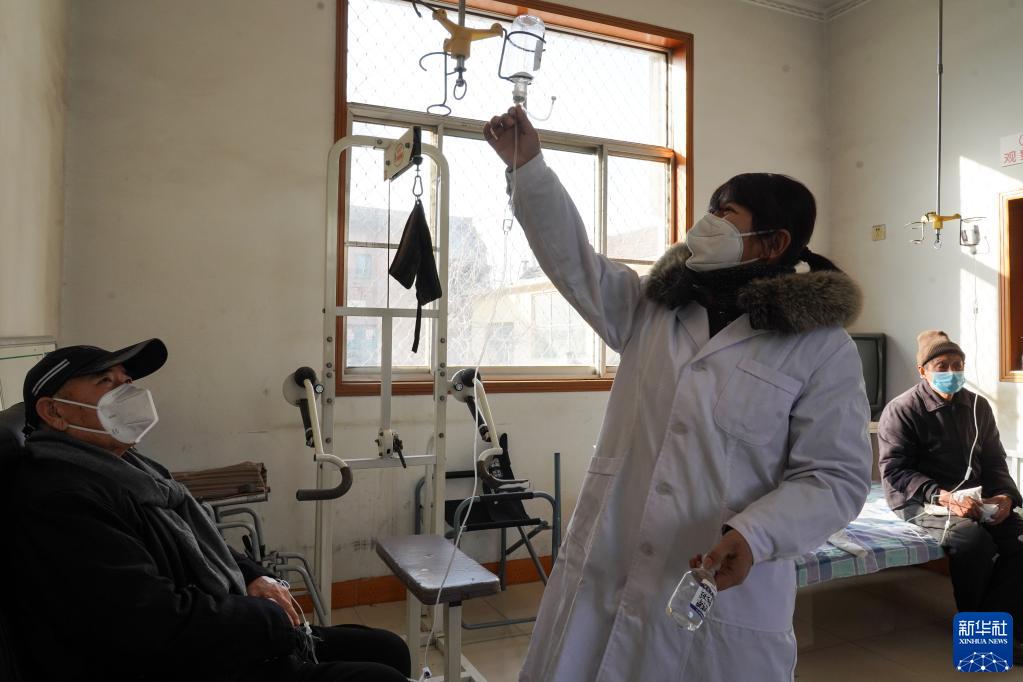 1月10日,山東省濟南市長清區大崮山村衛生室全科醫生王玉新為前來輸液的村民換藥。 為加強農村地區醫療健康服務,山東對農村地區老年人深入開展健康摸排,組建3.2萬個家庭醫生團隊,同時利用醫聯體、醫共體和城市醫療集團,縣鄉村三級醫療機構協同聯動,保障農村群眾用醫用藥。 新華社記者 朱崢 攝