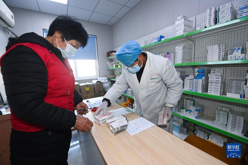 1月11日,在嘉興市南湖區余新鎮普光村衛生院內,暖心小分隊志愿者馬玲弟(左)為行動不便的村民代配高血壓、心臟病等慢性病的藥物。