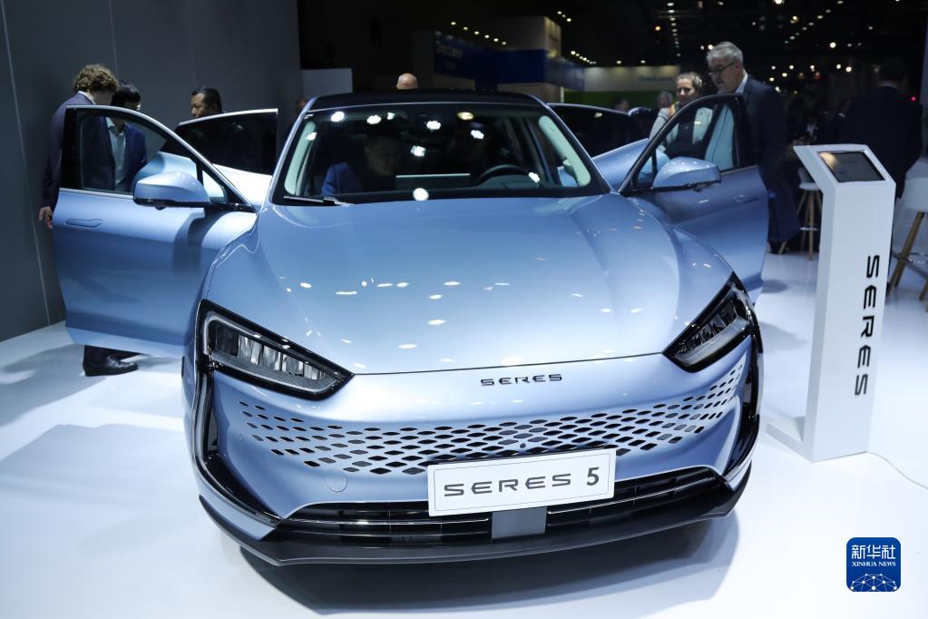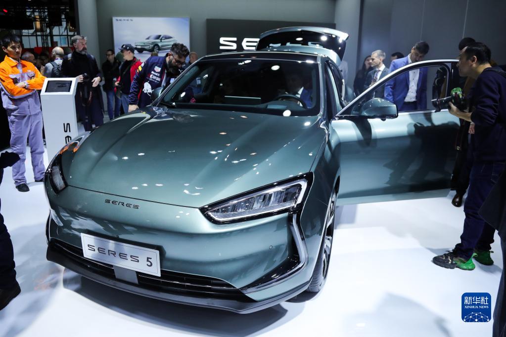 1月13日,人們在比利時布魯塞爾車展媒體開放日上參觀賽力斯5電動汽車。 第100屆比利時布魯塞爾車展13日迎來媒體開放日,這是該展覽疫情后首次線下舉辦。比亞迪、上汽、北汽、東風小康、賽力斯等中國品牌攜高端車型登陸車展,其中多款電動汽車備受矚目。 新華社記者 鄭煥松 攝