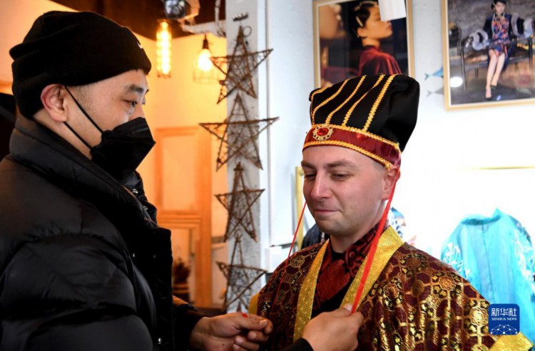 1月13日,在洛陽市洛邑古城一家漢服體驗館內,喬丹試穿漢服。 新華社記者 郝源 攝