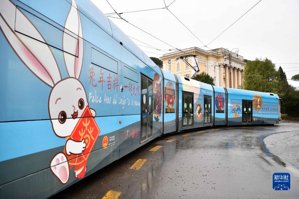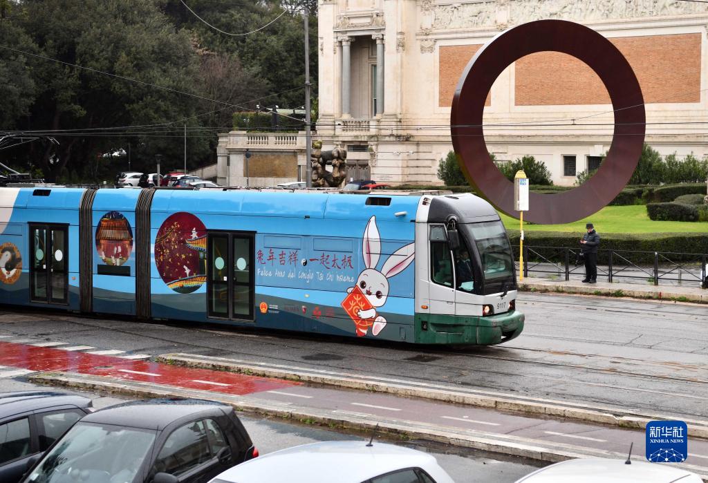 1月17日,兔年春節主題電車行駛在意大利羅馬街頭。 當日,兔年春節主題電車亮相意大利首都羅馬,慶祝即將到來的中國農歷新年。 新華社記者 金馬夢妮 攝