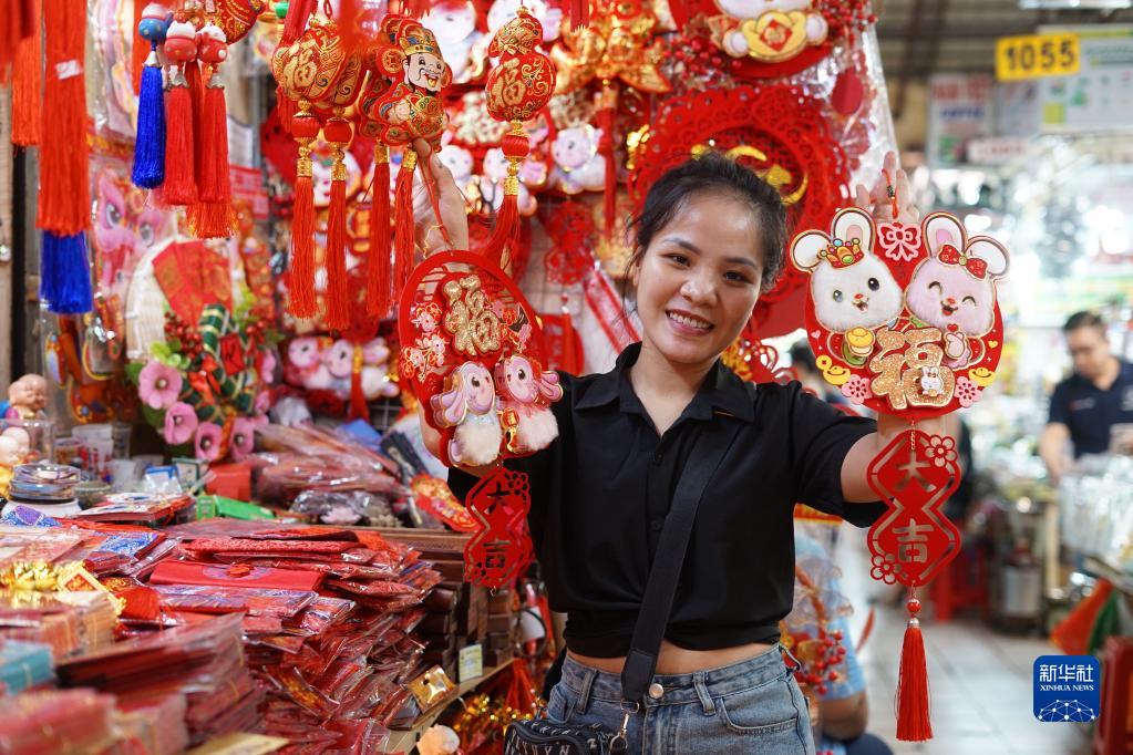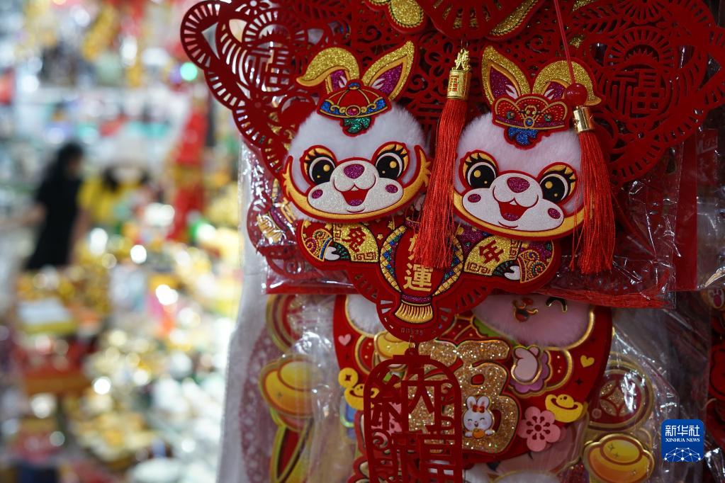 1月19日,在越南胡志明市邊城市場,一名商販展示店鋪內售賣的“兔元素”年貨。 農歷新春臨近,位于越南南部的胡志明市年味漸濃。盡管癸卯年是越南貓年,這里也有著“兔元素”的年貨和擺件。 新華社記者 胡佳麗 攝