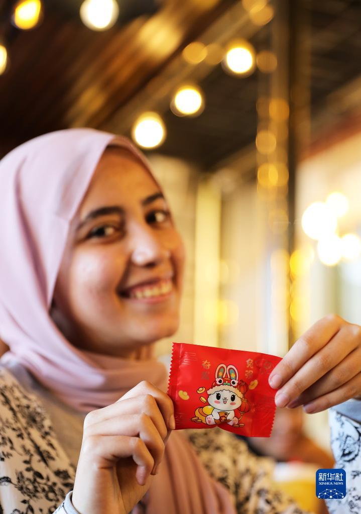 1月18日,一位顧客在位于埃及首都開羅的一家烘焙坊內感受中國春節氛圍。臨近中國農歷春節,這家烘焙坊推出兔年春節主題裝飾與商品,增添節日氣氛、吸引消費者。 新華社記者 王東震 攝