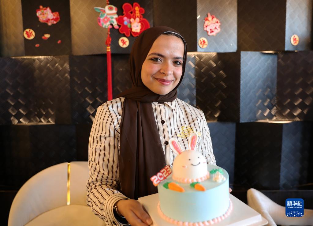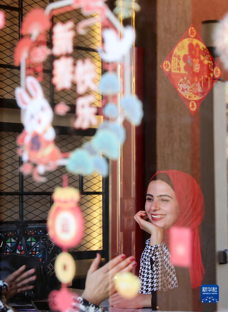 1月18日,顧客在位于埃及首都開羅的一家烘焙坊內感受中國春節氛圍。臨近中國農歷春節,這家烘焙坊推出兔年春節主題裝飾與商品,增添節日氣氛、吸引消費者。 新華社記者 王東震 攝