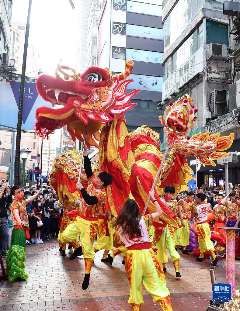 1月22日,香港灣仔街頭舉行舞龍表演,慶賀新春。