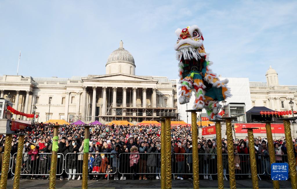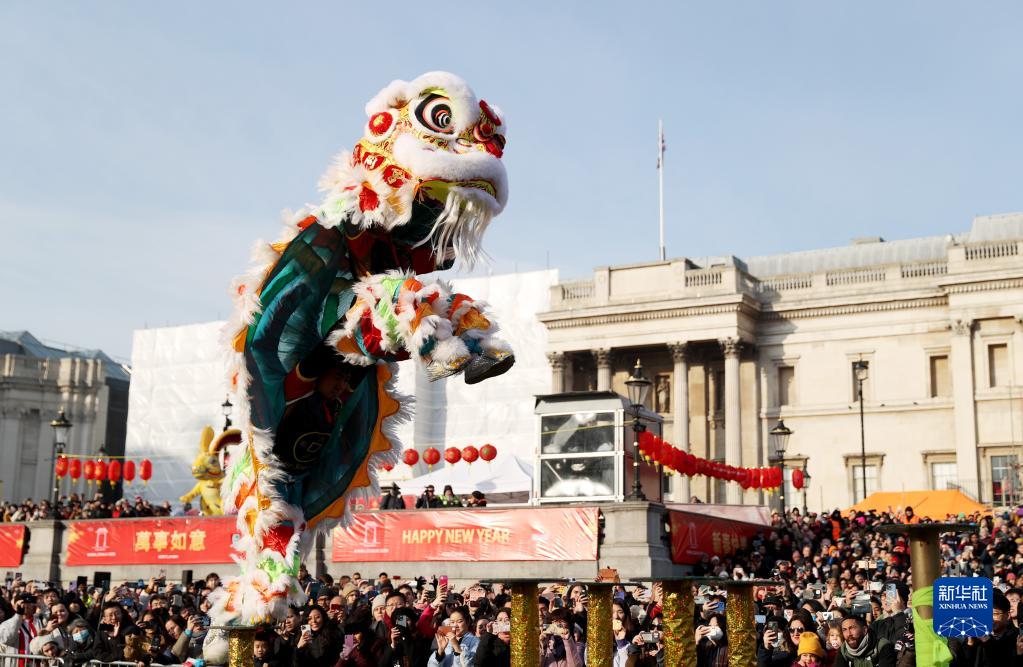 1月22日,在英國倫敦市中心的特拉法加廣場,演員表演舞獅。 當日,英國倫敦特拉法加廣場舉行春節慶典,慶祝兔年新春佳節。 新華社記者 李穎 攝