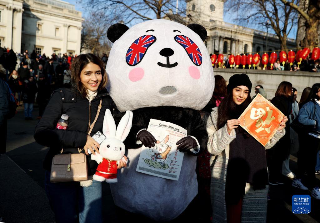 1月22日,在英國倫敦市中心的特拉法加廣場,兩名女子拍照留念。 當日,英國倫敦特拉法加廣場舉行春節慶典,慶祝兔年新春佳節。 新華社記者 李穎 攝