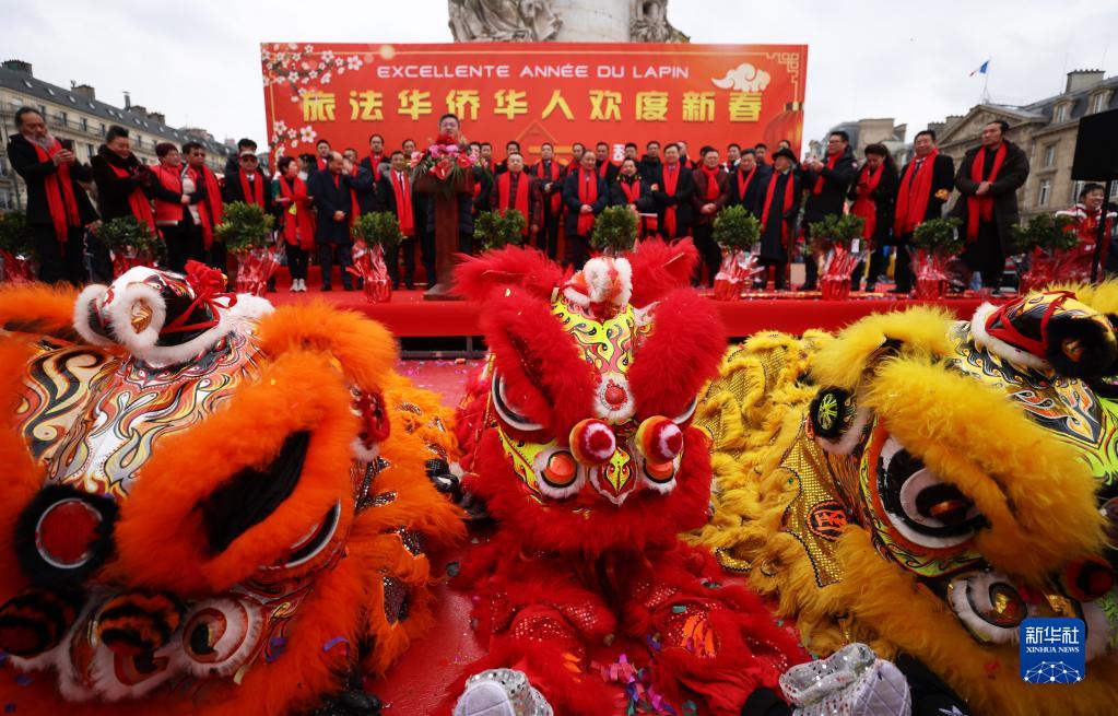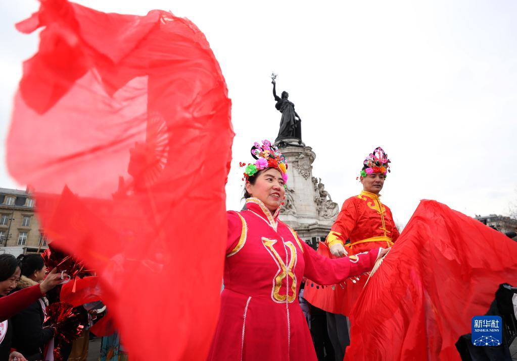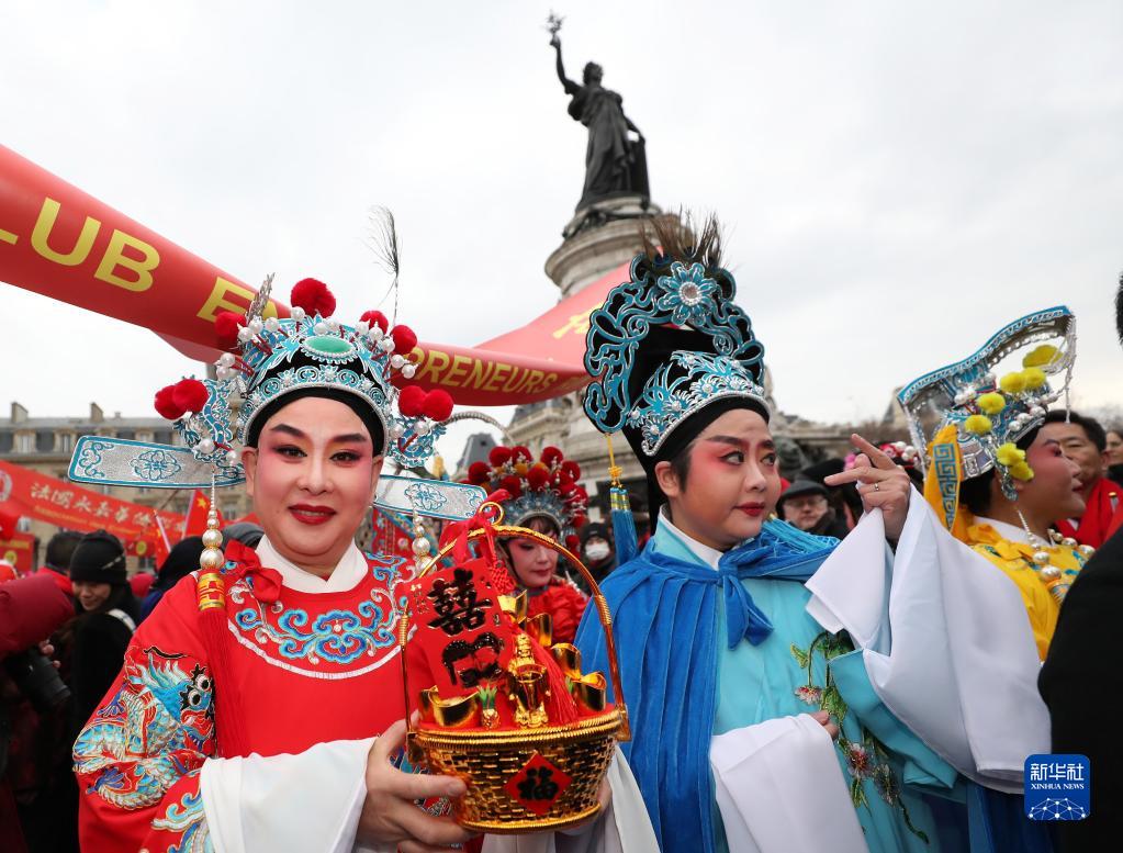 1月22日,在法國巴黎共和國廣場,演員在兔年春節彩妝游行上表演。 當日,法國巴黎舉行盛大兔年春節彩妝游行。該活動由當地多個華僑華人社團共同組織,慶祝農歷兔年春節的到來,吸引眾多市民前來參觀。 新華社記者 高靜 攝