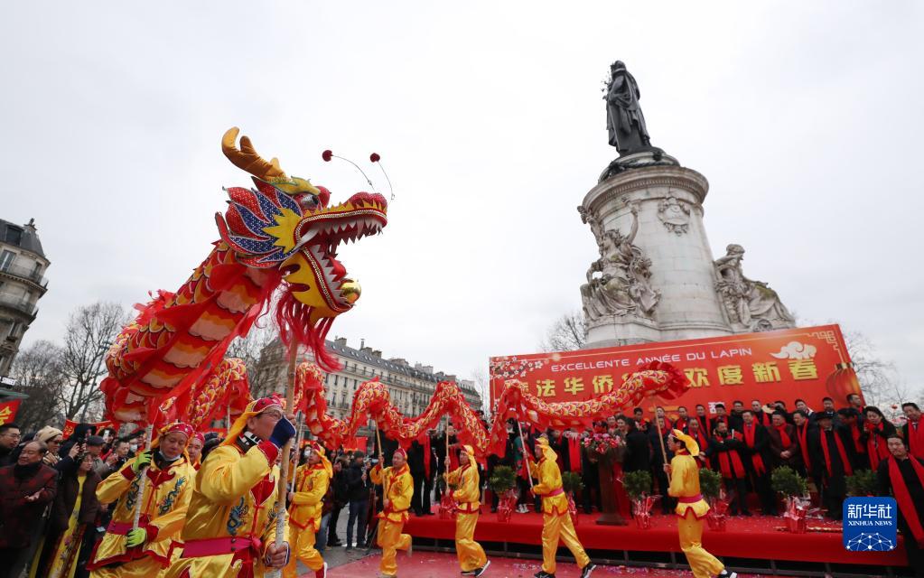 1月22日,在法國巴黎共和國廣場,演員在兔年春節彩妝游行活動現場表演舞龍。 當日,法國巴黎舉行盛大兔年春節彩妝游行。該活動由當地多個華僑華人社團共同組織,慶祝農歷兔年春節的到來,吸引眾多市民前來參觀。 新華社記者 高靜 攝