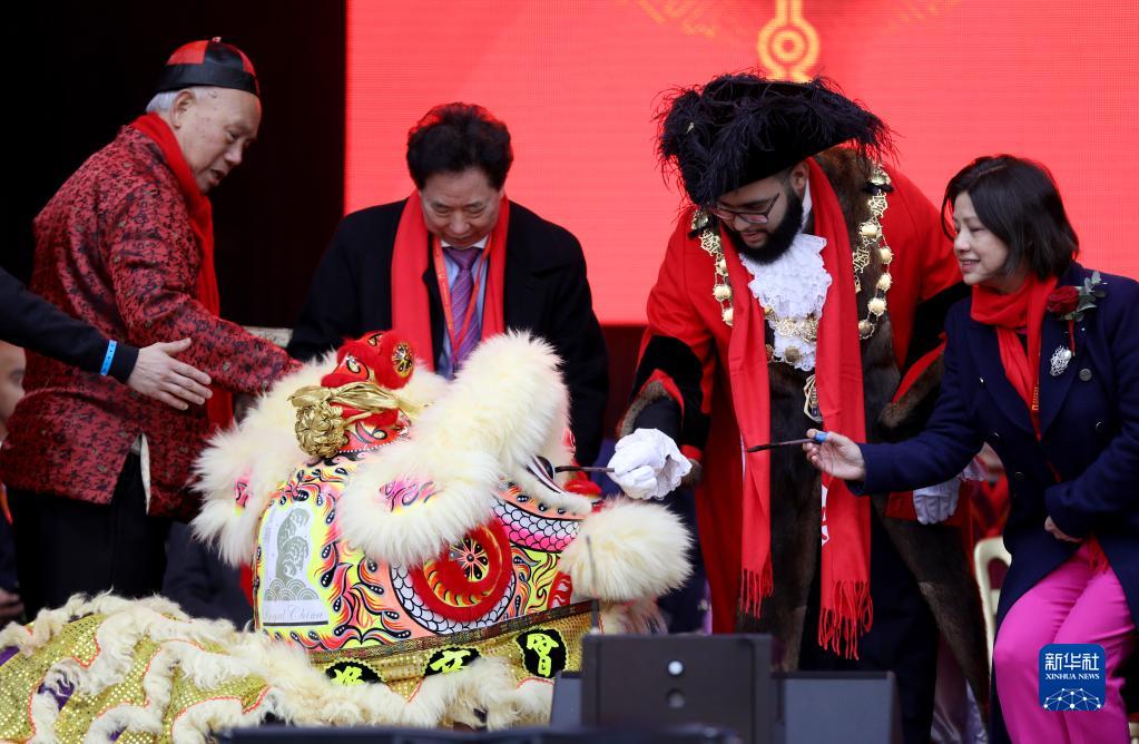1月22日,在英國倫敦市中心的特拉法加廣場,嘉賓在春節慶典上為獅子“點睛”。 當日,英國倫敦特拉法加廣場舉行春節慶典,慶祝兔年新春佳節。 新華社記者 李穎 攝