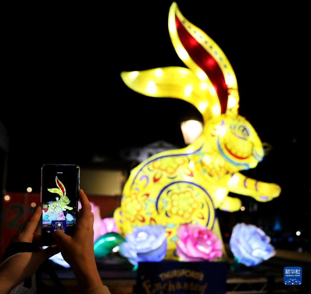 1月21日晚,游客在英國倫敦特拉法加廣場拍攝兔子彩燈。