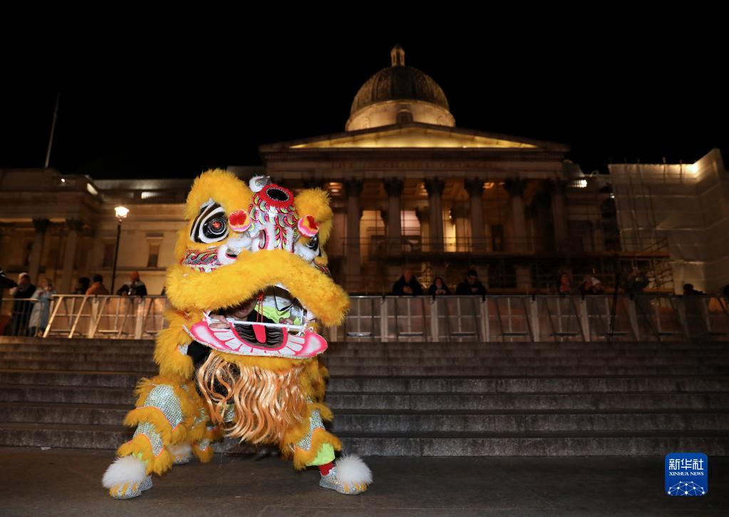 1月21日晚,演員在英國倫敦特拉法加廣場表演舞獅。 21日晚,倫敦特拉法加廣場點亮兔子彩燈,納爾遜紀念柱的柱身出現“恭賀新禧2023”字樣,迎接中國農歷新年。 新華社記者 李穎 攝 |