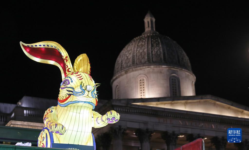 1月21日晚,兔子彩燈在英國倫敦特拉法加廣場點亮。 21日晚,倫敦特拉法加廣場點亮兔子彩燈,納爾遜紀念柱的柱身出現“恭賀新禧2023”字樣,迎接中國農歷新年。 新華社記者 李穎 攝