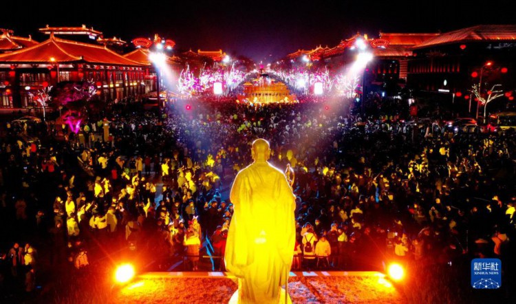 這是1月28日在西安大雁塔南廣場拍攝的景象(無人機照片)。 連日來,西安城墻、大唐芙蓉園、大唐不夜城等景區(qū)花燈璀璨,街頭流光溢彩,古都歷史與現(xiàn)實交相輝映,綻放魅力。 新華社記者 劉瀟 攝