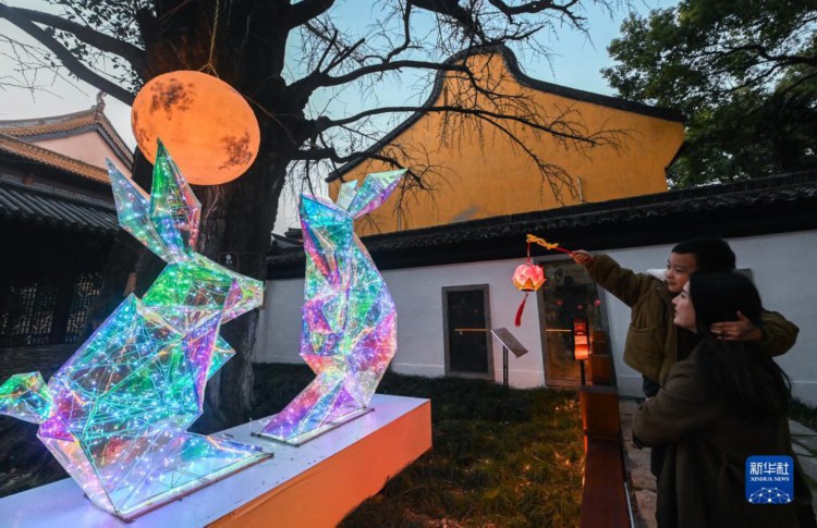 1月29日,在嘉興市秀洲區(qū)新塍古鎮(zhèn)小蓬萊公園內,游客在觀賞“鰲山燈會”的兔子彩燈。