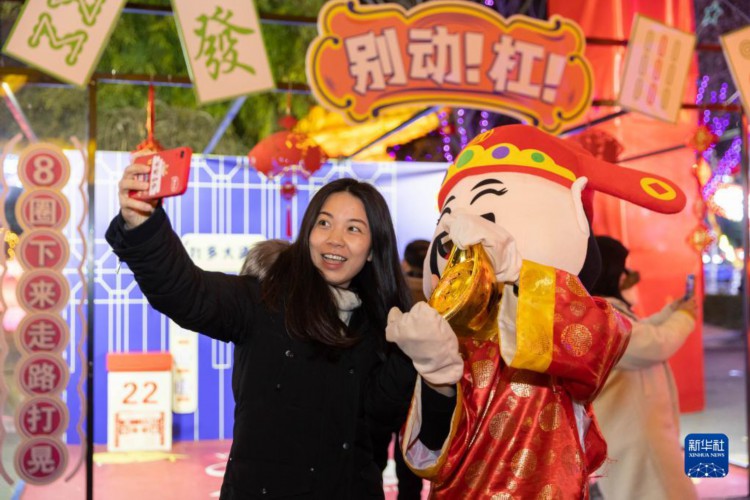 2月4日,在錦江樂園“盛世唐燈市集”,游客和“財神”自拍合影。 在上海錦江樂園舉辦的“盛世唐燈市集”主題活動上,游客逛集市、賞花燈、品美食,觀看霓裳飛天舞、舞獅等民俗表演,體驗豐富多彩的元宵活動。 新華社記者 王翔 攝