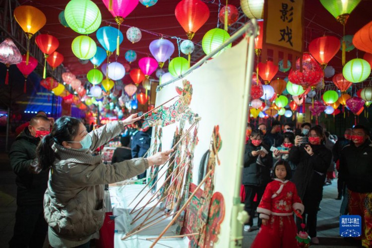 2月5日,市民在湖北省博物館的“鐘鳴楚天元宵夜”燈會游園活動上體驗皮影戲。 當日是元宵節,“鐘鳴楚天元宵夜”燈會游園活動在湖北省博物館舉行,吸引市民及游客觀賞游玩。 新華社記者 肖藝九 攝