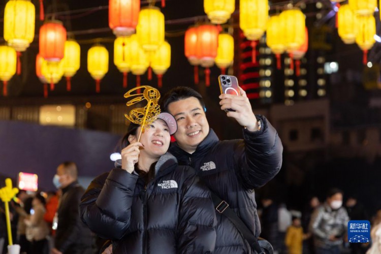 2月4日,游客在錦江樂園“盛世唐燈市集”自拍留影。 在上海錦江樂園舉辦的“盛世唐燈市集”主題活動上,游客逛集市、賞花燈、品美食,觀看霓裳飛天舞、舞獅等民俗表演,體驗豐富多彩的元宵活動。 新華社記者 王翔 攝