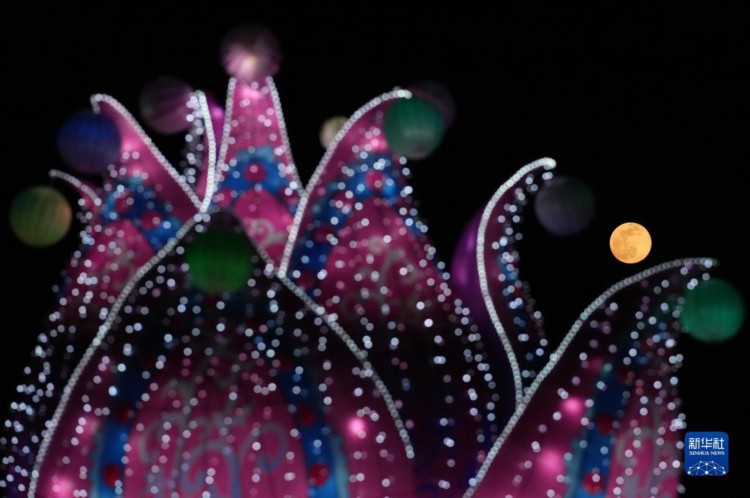 2月5日在北京世園公園拍攝的月亮和花燈。 當日是元宵佳節,在北京世園公園,北京世園花燈藝術節的170組、3900盞特色花燈,組成3千米花燈觀賞長廊及11個特色觀賞區,吸引了眾多游客前來賞花燈,度佳節。 新華社記者 鞠煥宗 攝