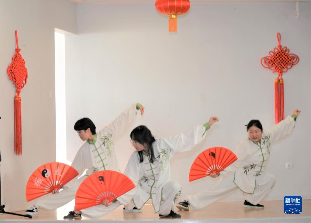 2月3日,在克羅地亞首都薩格勒布馬蒂亞·古貝茨國際學校,薩格勒布大學孔子學院的教師在“中國節(jié)進校園”活動中表演太極扇。