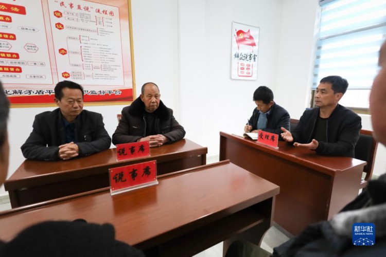在隴南市徽縣銀杏樹鎮高坪村,“民事直說委員會”成員調解村民鄰里糾紛(2月11日攝)。