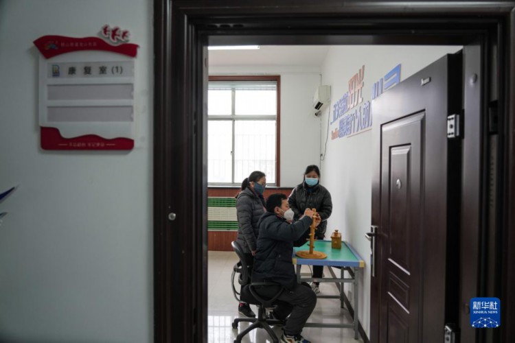 2月12日,在山東鄒城市鋼山街道龍山社區(qū)如康家園內(nèi),殘疾人在工作人員陪護(hù)下進(jìn)行康復(fù)訓(xùn)練。