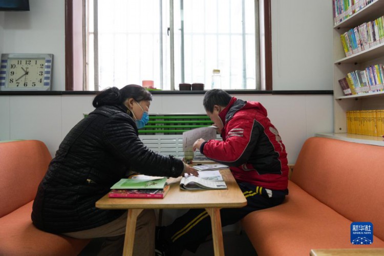 2月12日,在山東鄒城市鋼山街道龍山社區如康家園內,殘疾人(右)在工作人員陪護下閱讀書籍。
