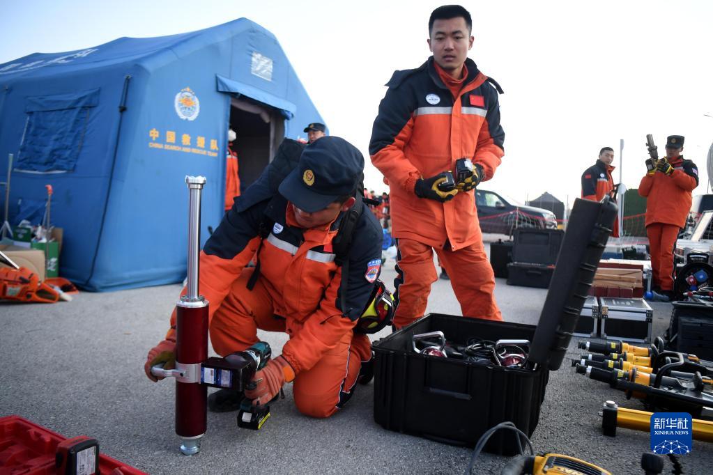 2月11日,在位于土耳其哈塔伊省哈塔伊體育館外的中國救援隊(duì)營地,救援隊(duì)隊(duì)員檢查設(shè)備。