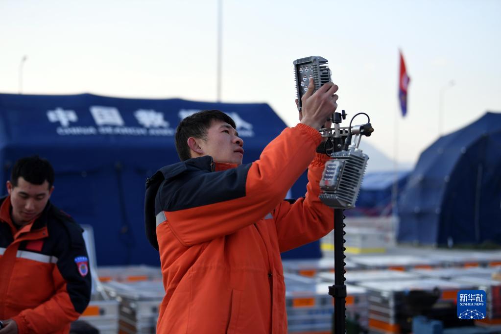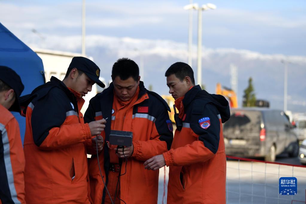 2月11日,在位于土耳其哈塔伊省哈塔伊體育館外的中國救援隊營地,救援隊隊員檢查設備。 新華社記者 沙達提 攝