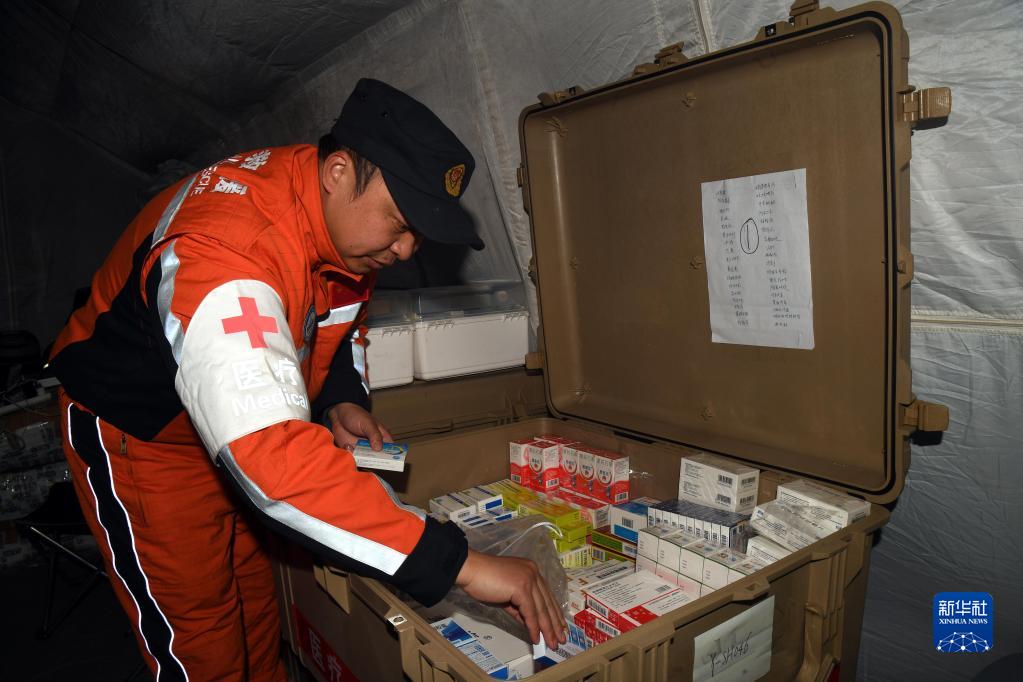 2月13日,在位于土耳其哈塔伊省哈塔伊體育館外的中國救援隊營地,醫生檢查藥品。 新華社記者 沙達提 攝 |