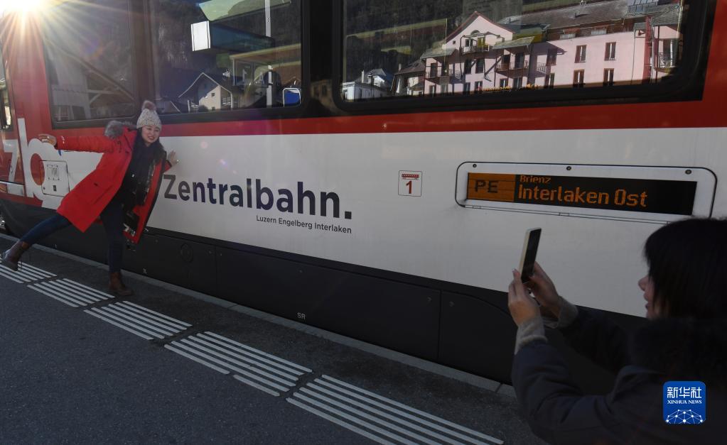 2月14日,中國游客在瑞士盧塞恩開往因特拉肯地區的金色山口列車旁拍照留念。 2月6日起,中國試點恢復赴瑞士等20個國家出境團隊旅游和“機票+酒店”業務。 新華社記者 連漪 攝
