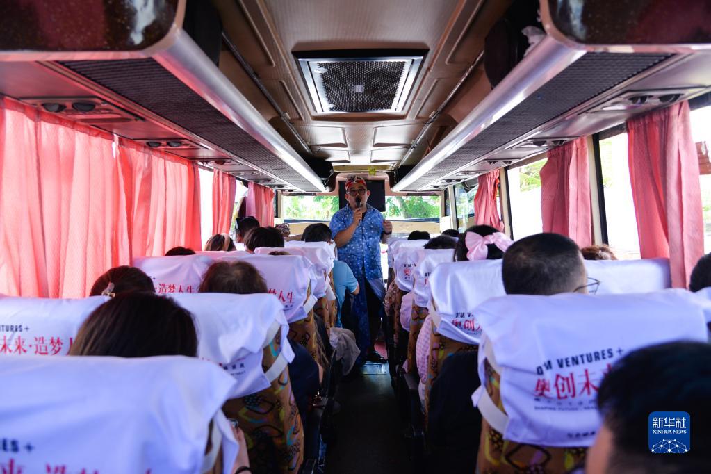2月12日,在印度尼西亞巴厘島,當地導游(中)在從機場前往酒店的大巴車上向中國游客介紹巴厘島。 1月22日以來,深圳-巴厘島的包機游直航航班已運行4班,杭州-雅加達-巴厘島旅游航線已開通,福州-巴厘島直航航線即將開通,中國大陸赴印尼巴厘島旅游正有序恢復。 新華社記者 徐欽 攝