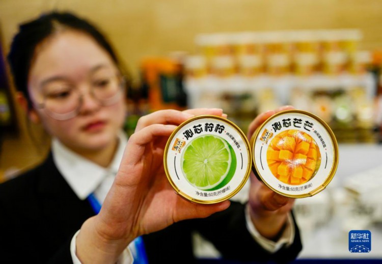 2月20日,在第五屆中國重慶·涪陵榨菜產業國際博覽會現場,一家榨菜企業的工作人員展示水果口味的榨菜新產品。