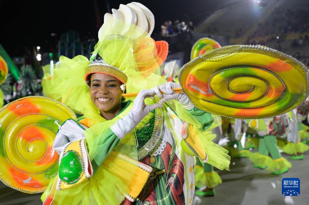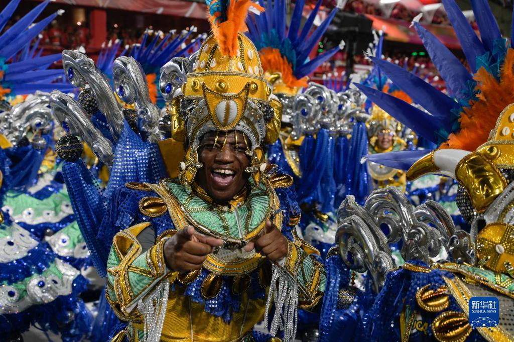 2月20日凌晨,在巴西里約熱內盧的桑巴大道,桑巴舞校演員參加狂歡節游行。 2月19日晚,巴西里約熱內盧舉行狂歡節特級組桑巴舞校表演。 新華社記者 陳昊佺 攝